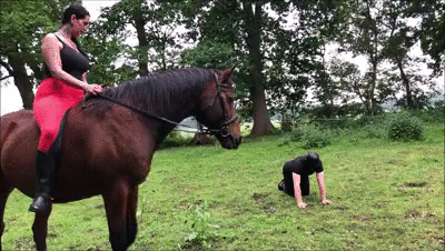Mistress Nica-Nordic kommt gerade von einem langen Ausritt ohne Sattel - während ihr Sklave die Stallungen gereinigt hat. Als erstes muss er sich neben die Herrin knien und ihre Reitstiefel lecken, während sie noch auf dem Pferd sitzt. Dann sitzt sie ab, er muss sich im dreckigen Stall auf den Boden legen und sie setzt sich auf sein Gesicht. Ihr Arsch nimmt ihm die Atemluft und er muss den Geruch seiner Herrin - und ihres Pferdes - ertragen!